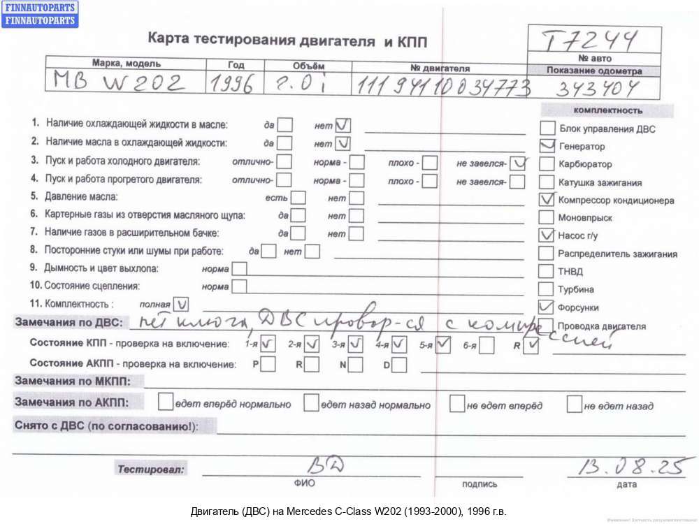 Компания FINNAUTOPARTS занимается продажей контрактных (б/у, бывших в употреблении) запчастей для иномарок. В нашей компании продаются только оригинальные запчасти из Европы, Японии и Кореи, которые не имеют пробега по РФ. Если вы хотите приобрести двигатель (ДВС) (бензиновый) для а/м Мерседес Бенц Ц (202 кузов), смело обращайтесь в нашу компанию. Все наши менеджеры — профессионалы своего дела, и с удовольствием помогут вам купить запчасти, в том числе, двигатели (ДВС) бензиновые, на Mercedes-Benz C (W202) и другие автомобили.