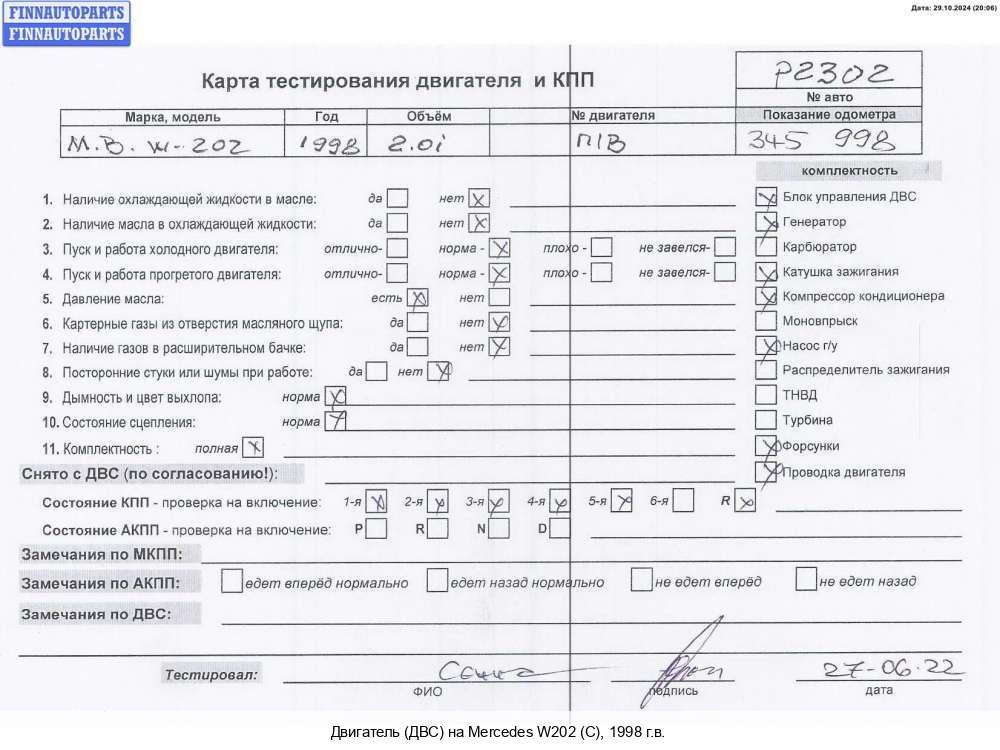 | Уфа | 1998 | 61196030017932, 1998, 2.2л, Дизель, CDI, OM 611.960, 61196030017932, 61196030017932, Седан, серебристый, Фото не актуально, с запчасти отделены: Генератор, Патрубок интеркулера, Маховик, Турбина, Патрубок корпуса воздушного фильтра, Трубка турбины, Трубка турбины, Насос гидроусилителя руля (ГУР), Компрессор кондиционера, Подушка крепления двигателя, Подушка крепления двигателя, Рампа (рейка) топливная, Трубка ТНВД, 61196030017932 | - | К, прокручивается, состояние ГРМ - нормально, поддон - нормально, клапанная крышка - нормально, эмульсия - нет, насос ГУР - бит шкив, | |||