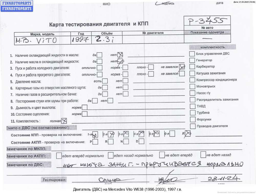 Новосибирск | 2002 | A6110108244, 2002, 2.2л, Дизель, CDI, OM 611.980, 61198050502918, A6110108244, Микроавтобус, белый, Фото не актуально, с запчасти отделены: Маховик, Форсунка топливная, Форсунка топливная, Генератор, Патрубок охлаждения, Патрубок вентиляции картерных газов, Турбина, 61198050502918 | - | К | Н, прокручивается, состояние ГРМ - нормально, поддон - нормально, клапанная крышка - нормально, эмульсия - нет, 2 массовый, форсунки за коксованы не снимается, за ломаны болты, не снимаются, | |||